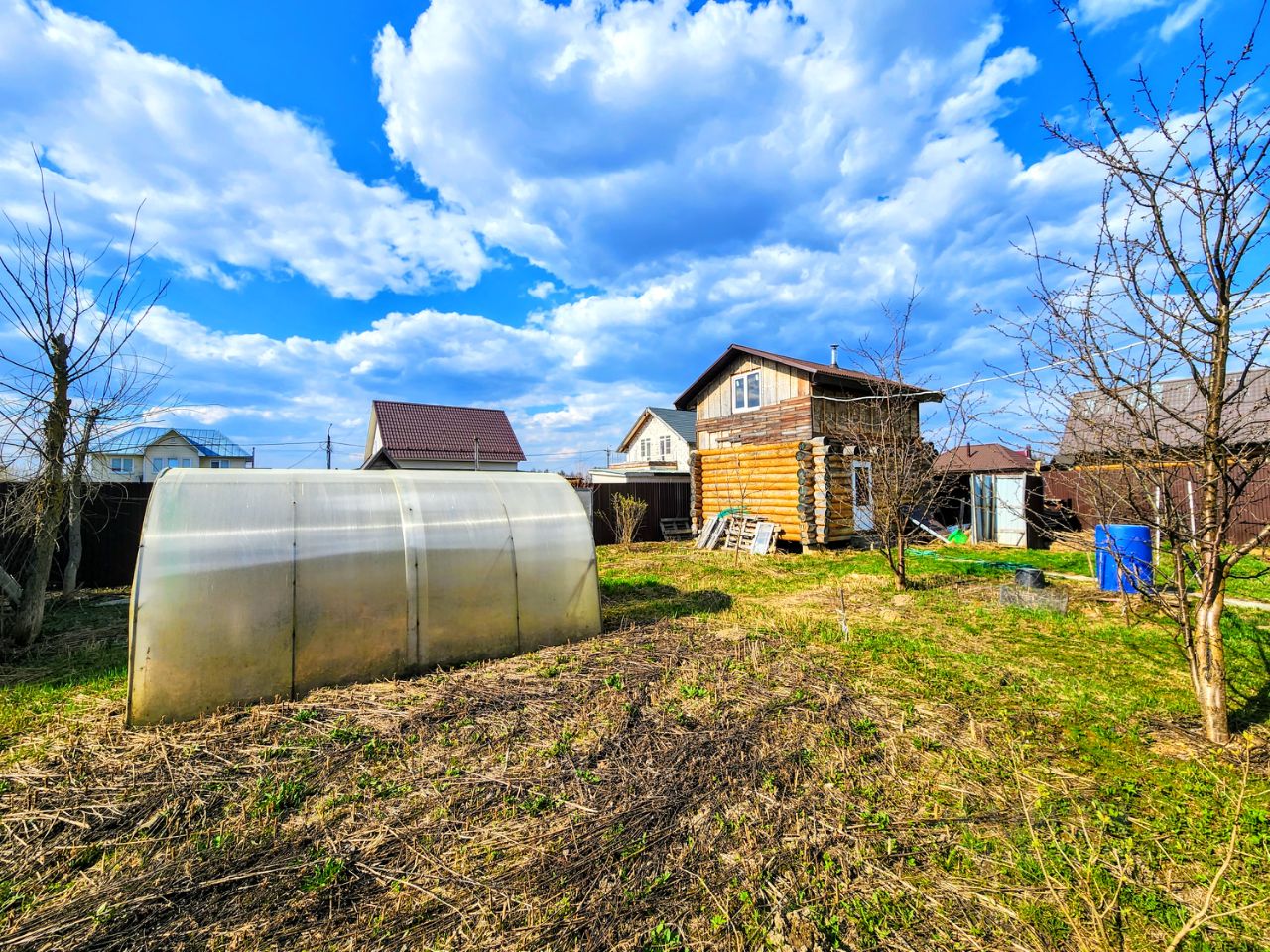 Участок: ровный, сухой, правильной формы, огорожен забором, на участке: баня, теплица, плодовые деревья и кустарники.