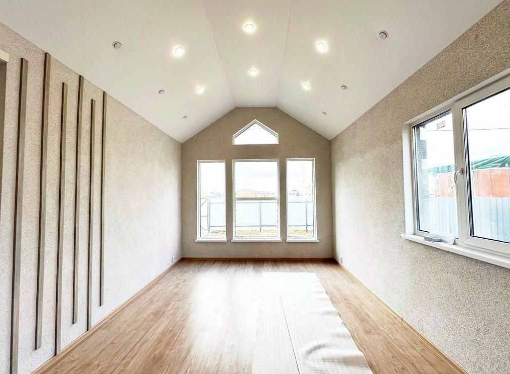 Крыша из металлочерепицы, утеплена 200 мм, пластиковые двухкамерные окна, натяжные потолки с подсветкой.