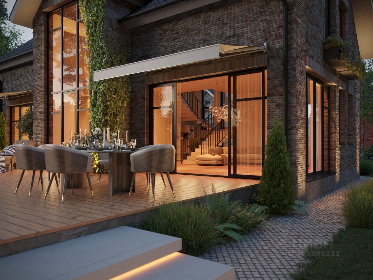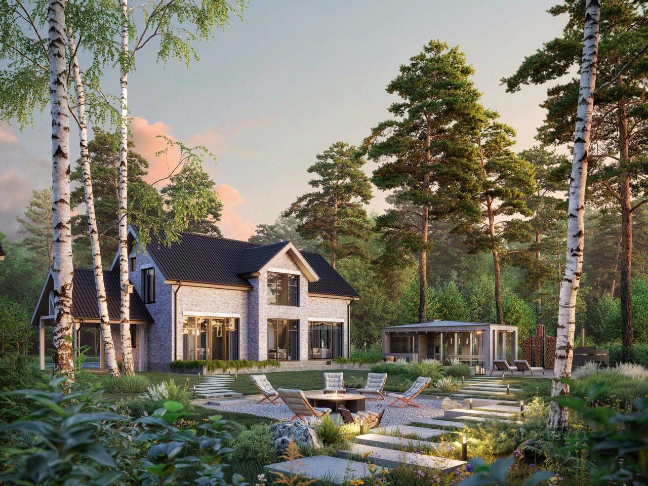 Уютный дом 84 площадью 230 кв. м. на участке 6 соток. Просторная планировка, современные материалы и панорамные окна.