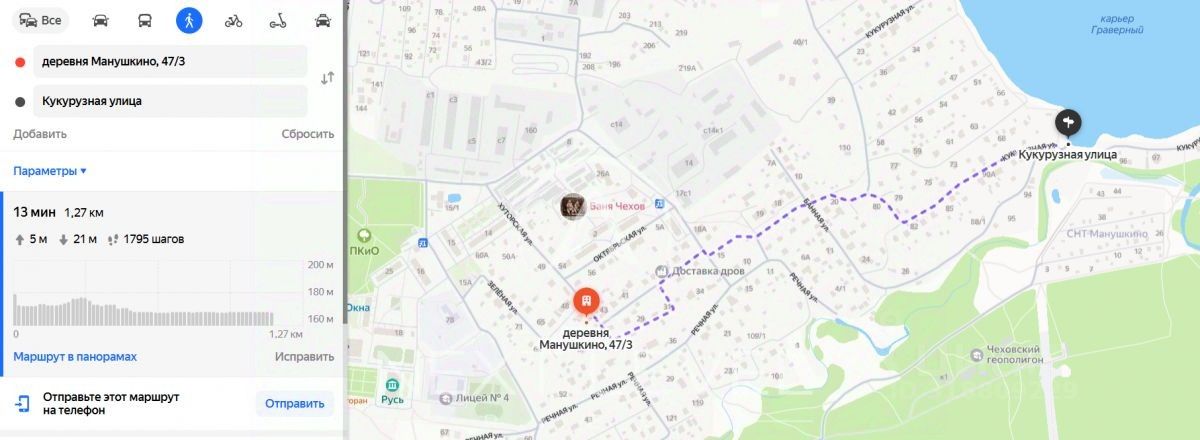 Транспортная доступность: Асфальтированная дорога до участка. До центра города Чехов 10 минут на машине, автобусная остановка 5 минут пешком.