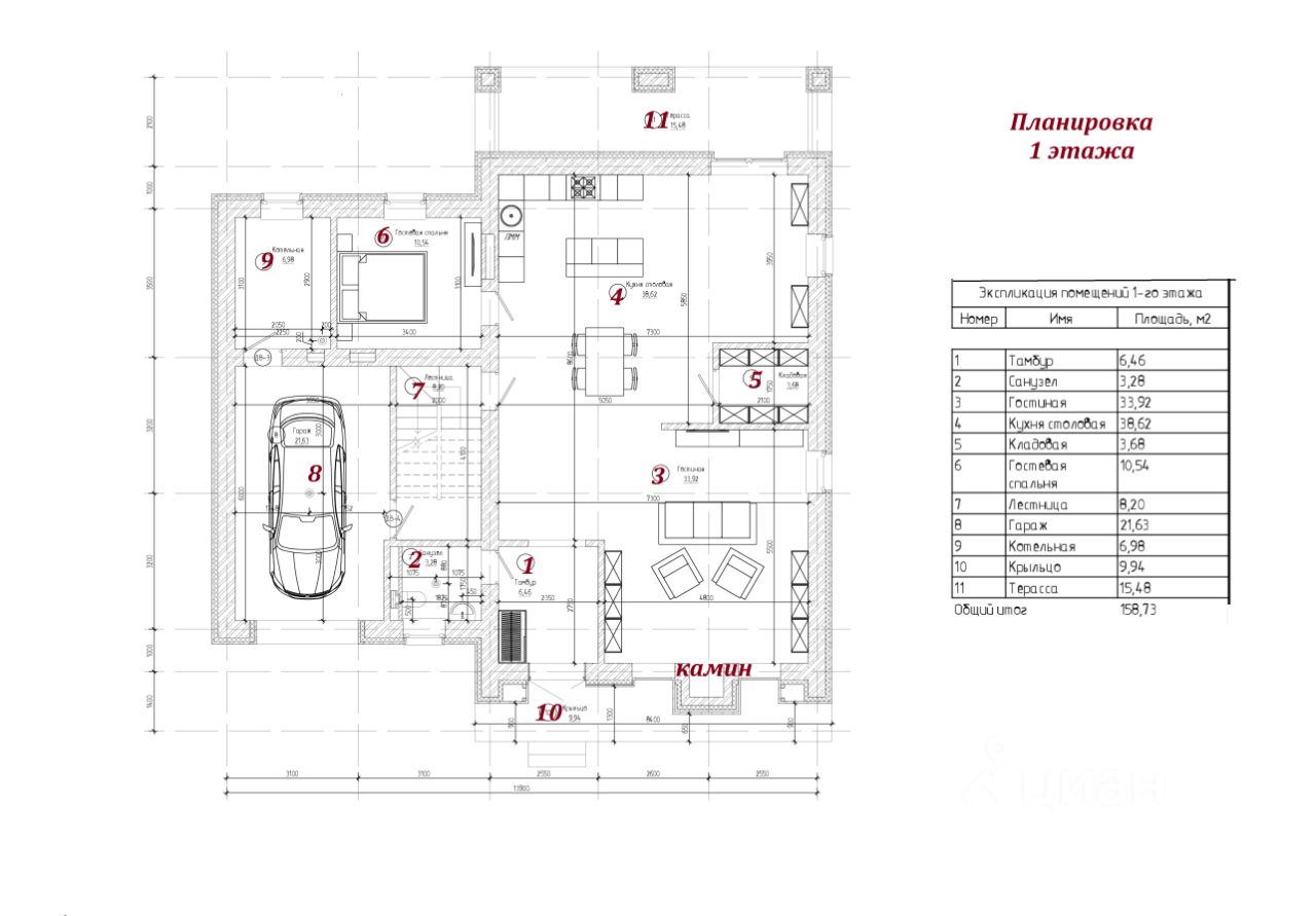 Планировка дома: 1 этаж: холл прихожая, кухня- столовая с выходом на открытую террасу, гостиная настоящим камином для зимних вечеров, гостевая спальня ( или кабинет для рабочих моментов), ванная комната, котельная, гараж.