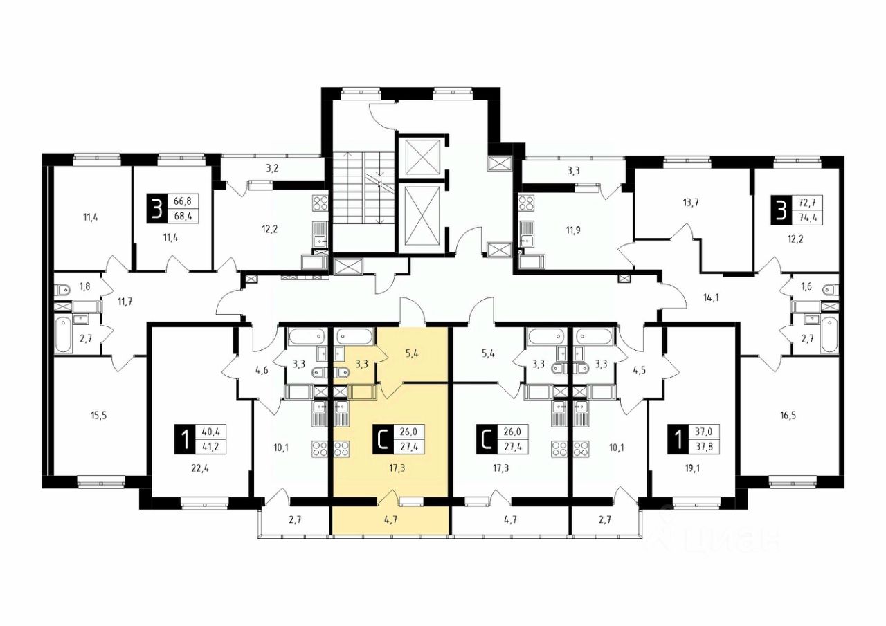 Продаётся студия в строящемся доме (Корпус 1), срок сдачи: 1-кв. 2026, общей площадью 27.40 кв.м., на 12 этаже.
