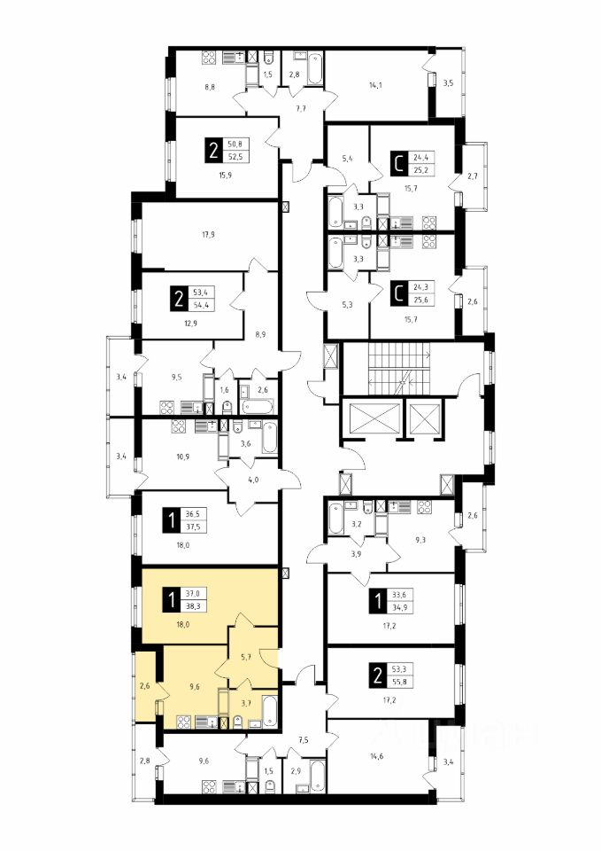 Продаётся 1-комнатная квартира в строящемся доме (Корпус 1), срок сдачи: 1-кв. 2026, общей площадью 38.30 кв.м., на 12 этаже.