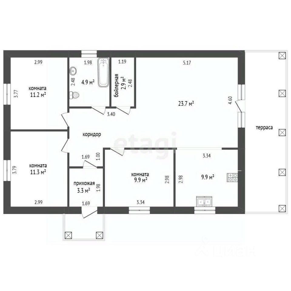 Основные характеристики: Площадь дома: 106 м2. Участок: 6 соток, ровный, прямоугольной формы. Ограждение: забор из профлиста по всему периметру. Планировка: 3 комнаты, отдельная кухня, гостиная, бойлерная, санузел, просторная терраса.