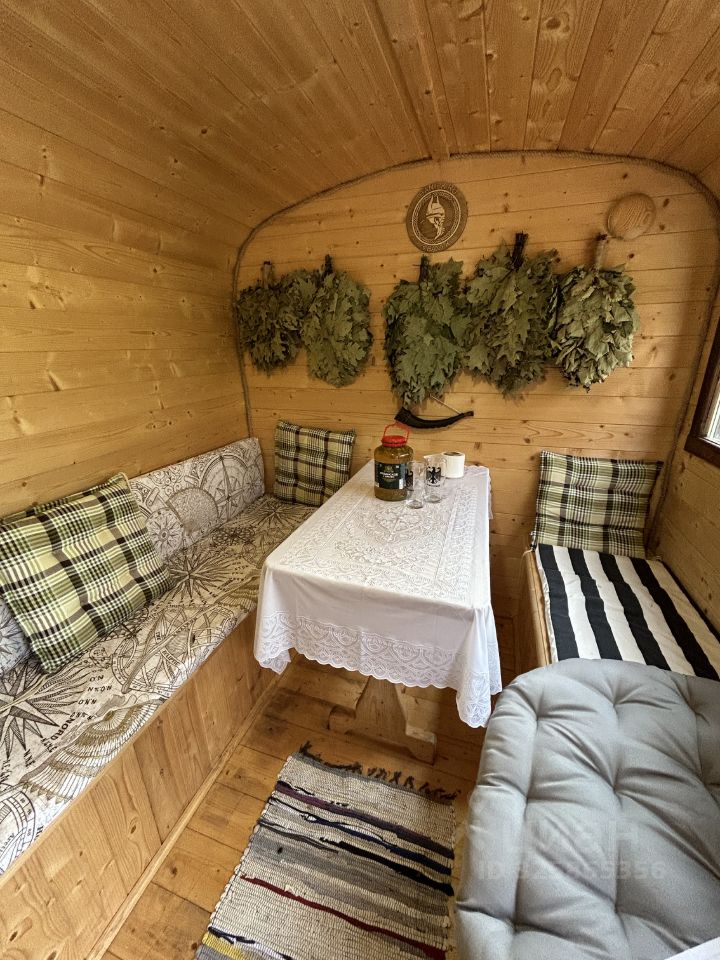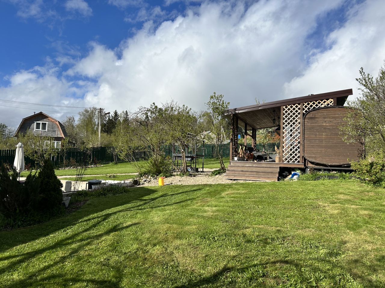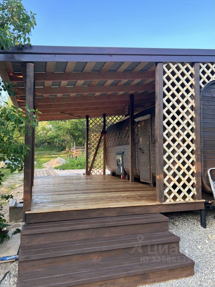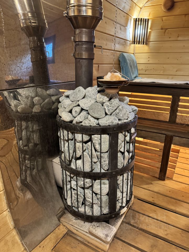 Баня: баня-бочка (комната отдыха + парная) поставлена на свайный фундамент, вокруг идет терасса с местом для бассейна. Печь Harvia.