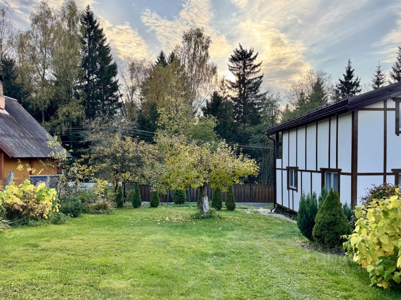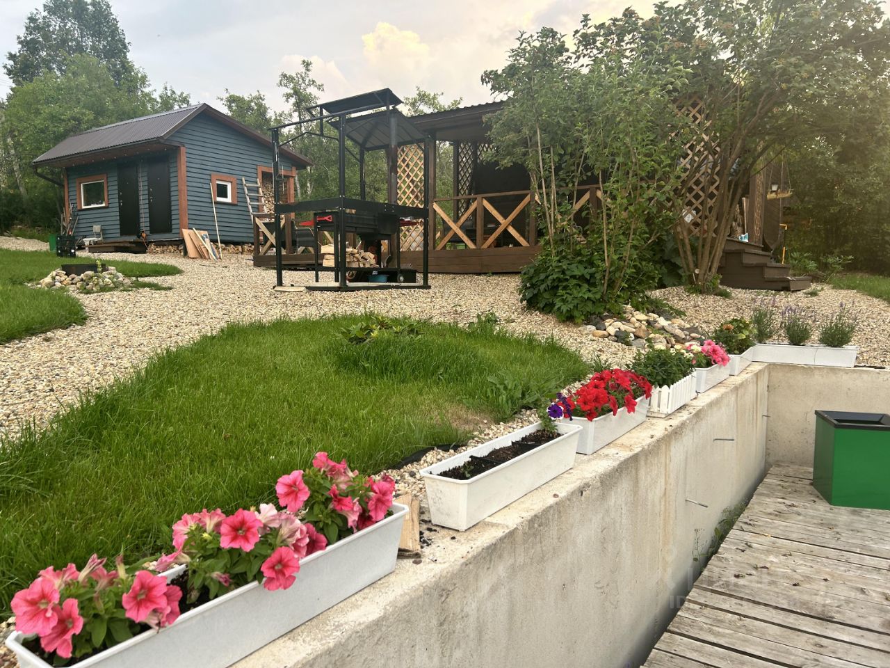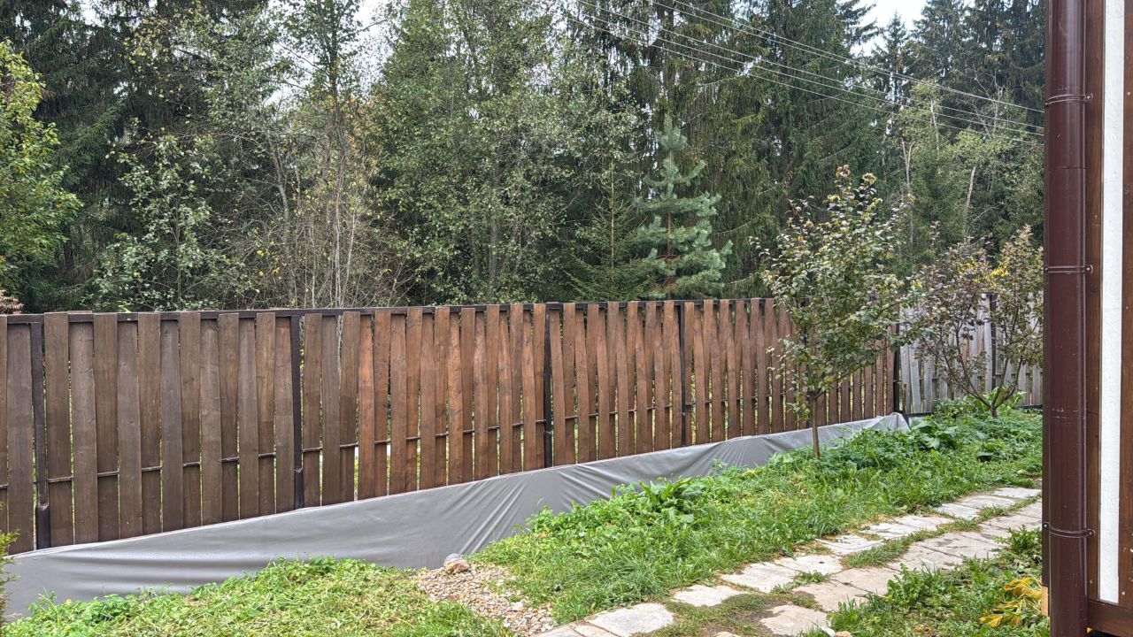 Участки наклонные, сделано выравнивание, сооружена бетонная подпорная стенка. На участке организованы цветники, растут яблони, груша, кустарники. Есть парковка для двух автомобилей.