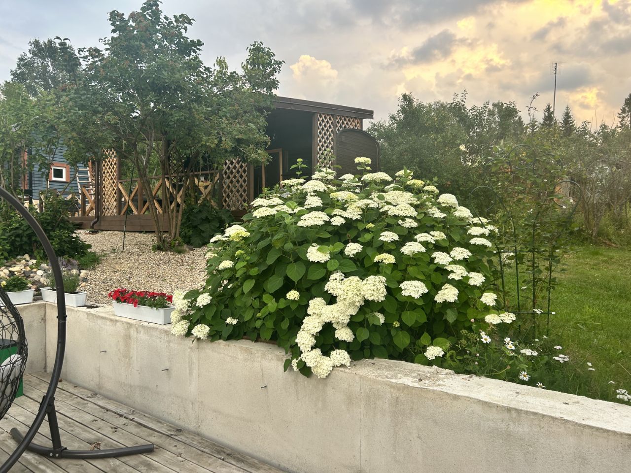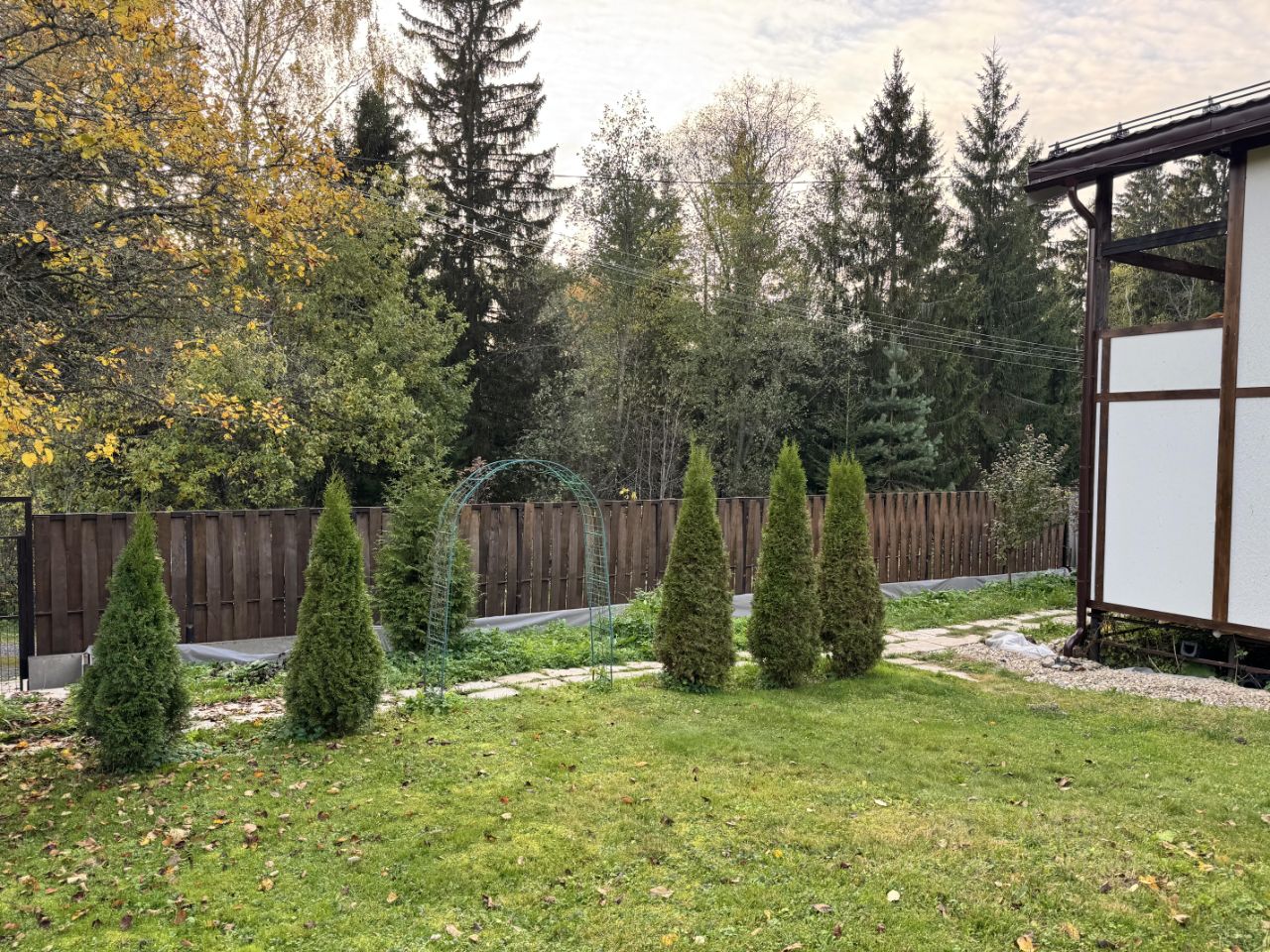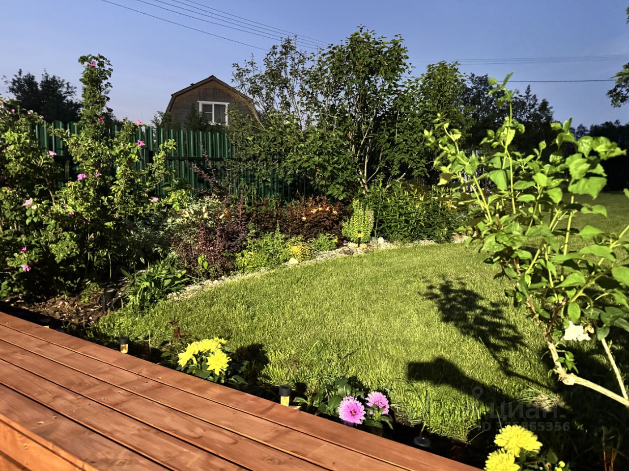 Участки наклонные, сделано выравнивание, сооружена бетонная подпорная стенка. На участке организованы цветники, растут яблони, груша, кустарники. Есть парковка для двух автомобилей.
